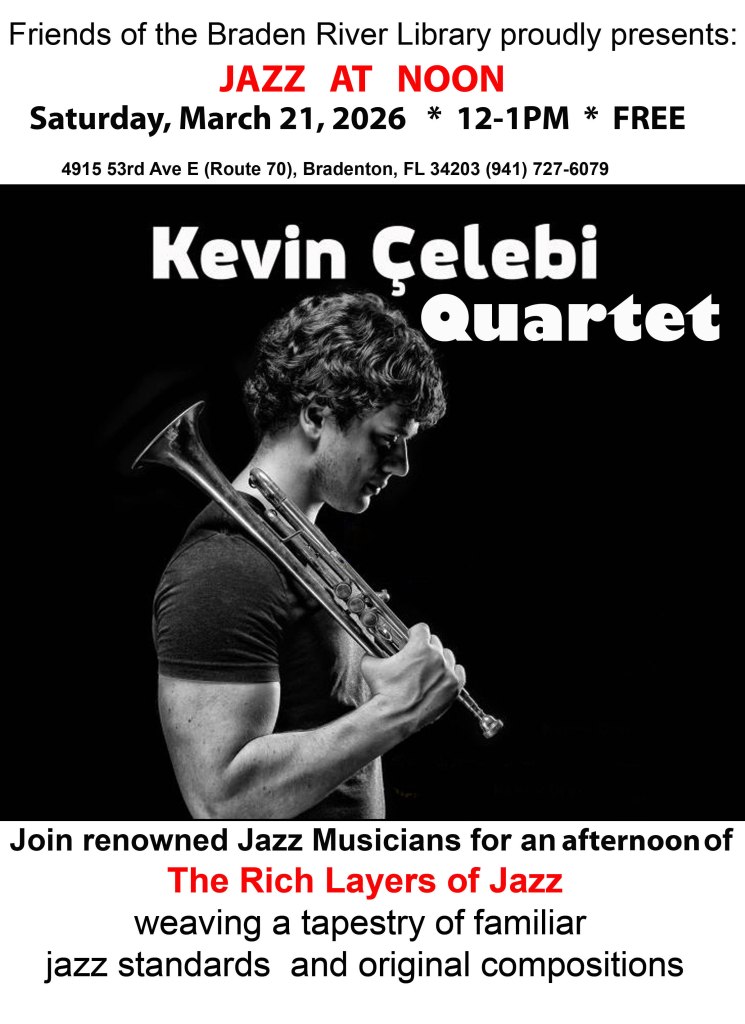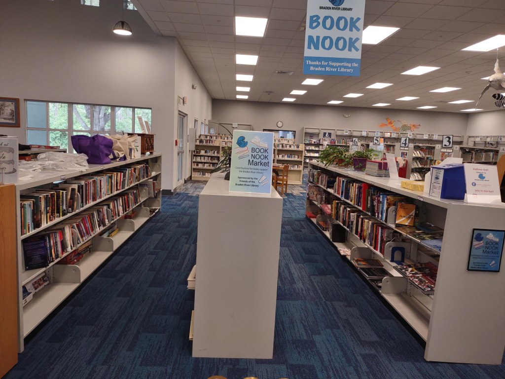 Greetings, fellow book lovers…..that’s YOU! If you just can’t wait until the next Friends book sale at Braden River Library, here’s a great solution — the Book Nook. Inside the library are shelves and shelves of goodies for sale at remarkable prices. Make your selection, deposit what you’d like to pay (please be generous), and hurry home to start reading. Fiction, non fiction, cookbooks, puzzles, DVDs, CDs. You should come and take a look to buy your next new, favorite book.