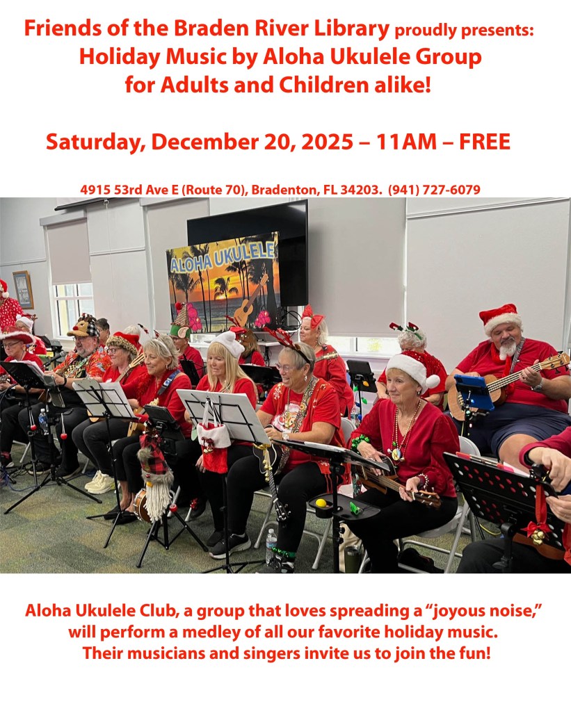 Aloha Ukulele Club is a group that loves spreading a “joyous noise,” will perform a medley of all our favorite holiday music. From beginners to seasoned players, as well as singers and many instrumentalists, all are welcome to join the fun. Aloha Ukulele Club is a group that loves spreading a “joyous noise,” will perform a medley of all our favorite holiday music. From beginners to seasoned players, as well as singers and many instrumentalists, all are welcome to join the fun.